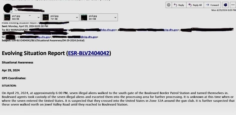 “Boulevard agents took custody of the seven illegal aliens and escorted them into the processing area for further processing,” a Border Patrol official wrote in an email to agents in the region.