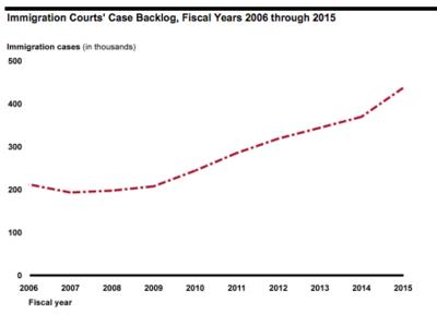 Using data from the Governmental Accountability Office, CIS said that there is a backlog of about 437,000 cases pending before immigration courts, and the average time for each is 404 days.