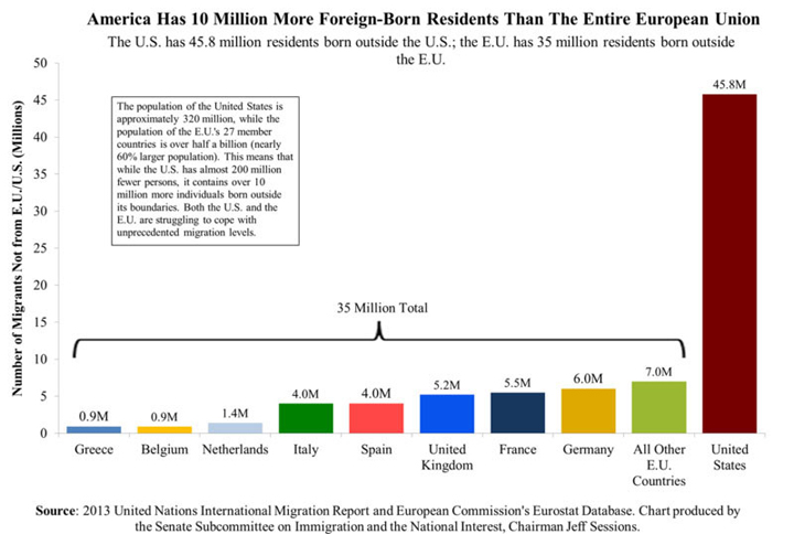 A background document from the Judiciary Committee’s Subcommittee on Immigration and the National Interest, chaired by Alabama Sen. Jeff Sessions, said as a share of population, roughly 1 in 14 were born outside the E.U. compared to nearly 1 in 7 in the U.S.