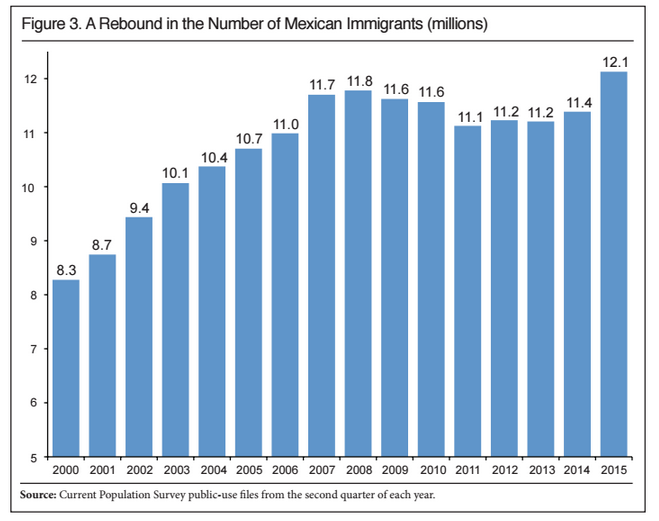 That’s the largest number on record and beats out the 11.8 million Mexicans present in the country back in 2008. The Great Recession dropped that number to about 11 million, but immigration from Mexico now appears to have rebounded.
