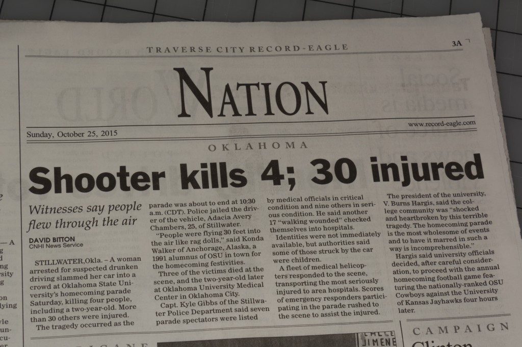 “Shooter kills 4; 30 injured,” read the Traverse City Record-Eagle’s Sunday headline. There was no shooting involved in the weekend’s fatal car crash.