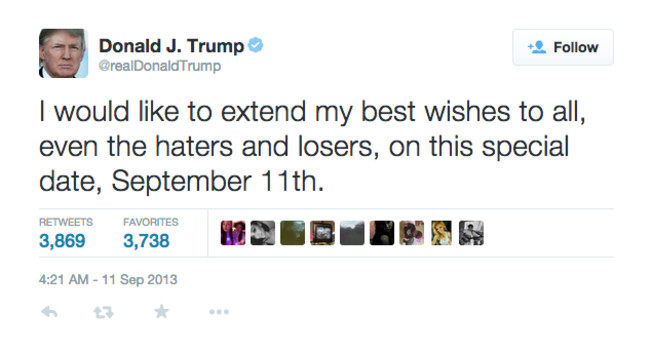 “@realDonaldTrump: I would like to extend my best wishes to all, even the haters and losers, on this special date, September 11th.”