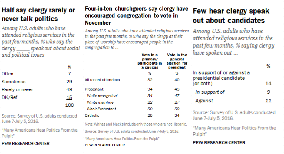 “We found that many people are hearing at least a little bit about politics from their clergy and religious leaders in their places of worship,” she said. “But at the same time, it’s a much smaller share who are hearing clergy say something specifically about a presidential candidate.”