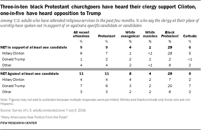 It’s important to note: Compared to African-American Protestants, far fewer Catholics, white evangelicals and white “mainline” Protestant churchgoers have heard their faith leaders say anything from the pulpit about specific the 2016 candidates.