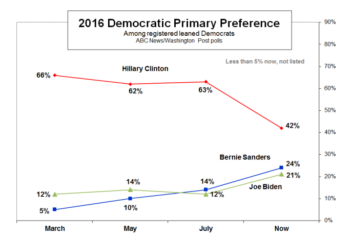 Clinton was the preferred choice for 63 percent of Democrats when they were polled in July. But in the new poll, her support sits at just 42 percent, a 21 percent drop for the frontrunner.