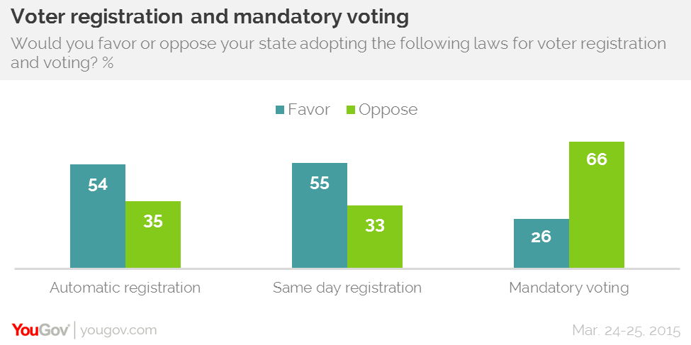 However, a majority of Americans (66 percent) do not support making voting mandatory — thus making those who do not vote face criminal penalties. Less than three in 10 Americas (26 percent) support compulsory voting.
