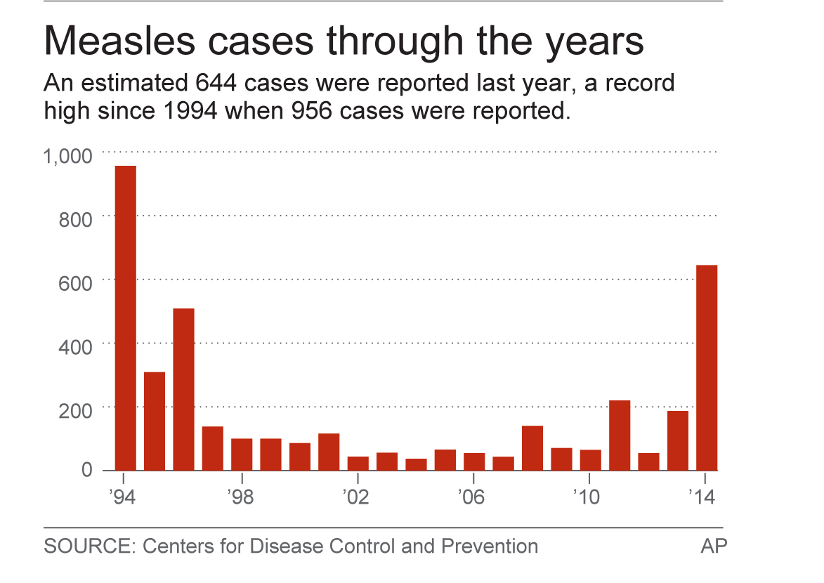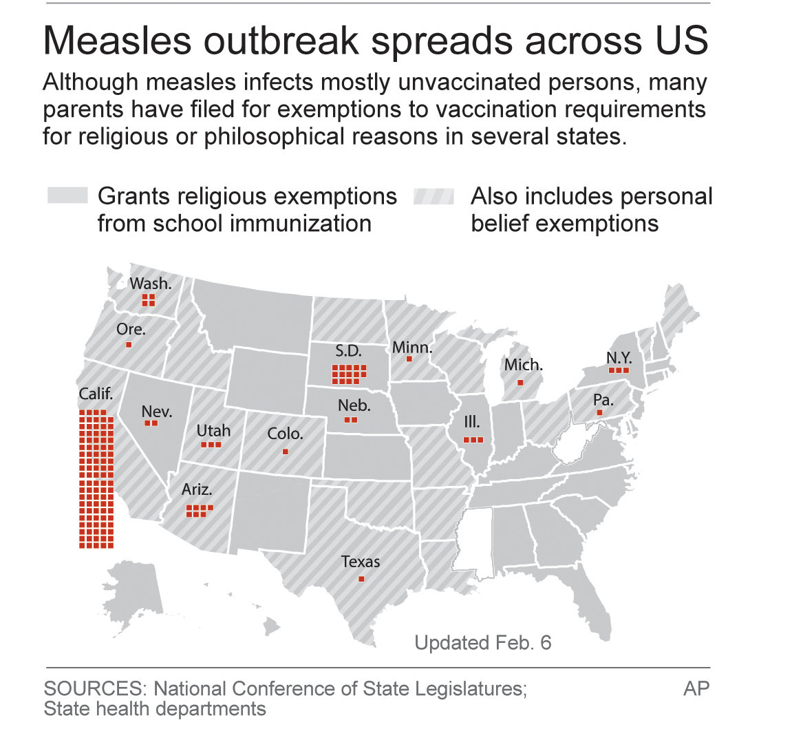 The measles outbreak this year started in Orange County, when the virus spread at Disneyland. Of the country’s 154 confirmed cases, a majority are in California, where the rate of personal belief exemptions from getting vaccinated has more than doubled since 2002.