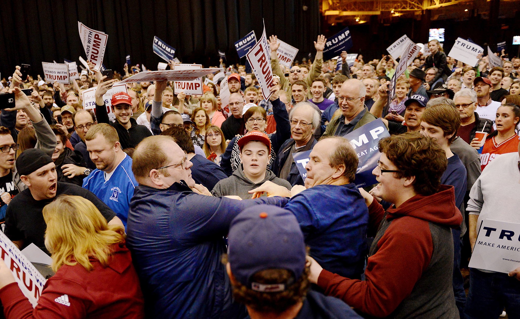 As Trump’s campaign rallies increasingly degenerate into fisticuffs, fingers are pointing over who’s to blame. (AP Photo)