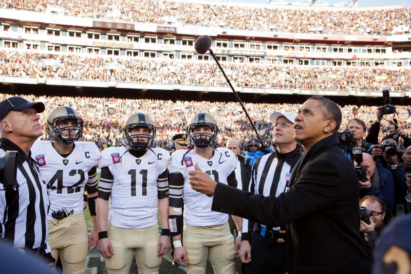 Tossing the coin before the Army-Navy game (2011.) “The car companies themselves told Gov. Romney to knock it off. GM said, ‘We think creating jobs in the United States should be a source of bipartisan pride.’ They don’t want this to become some political football in Governor Romney’s TV ad. And I couldn’t agree more.”