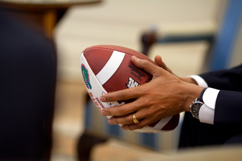 Obama grips a football, one bearing the logo of the Florida Gators, in his hands during an Oval Office meeting on health care in 2009.“Let’s be clear: Republicans know — what the episode in the last 24 hours shows I think reinforces the idea that this is becoming a political football and a partisan effort. They cherry-pick some documents and try to make hay out of something that, when looked at in its entirety, only reinforces what we’ve said, which is that there was no political influence in the decision-making progress.” On the defensive for not turning over documents related to green-energy firm Solyndra, Carney in November 2011 accused Republicans of waging a false political war against the White House.