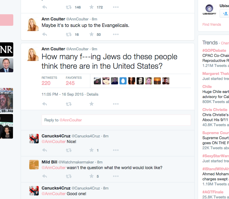 Other tweets on the subject by Coulter included: “Good grief! Huckabee is running for PM of Israel,” “Christie also talks @ Israel in response to the question: What will AMERICA look like after you are president?” and “How to get applause from GOP donors: 1) Pledge to start a war 2) Talk about job creators 3) Denounce abortion 4) Cite Reagan 5) Cite Israel.”