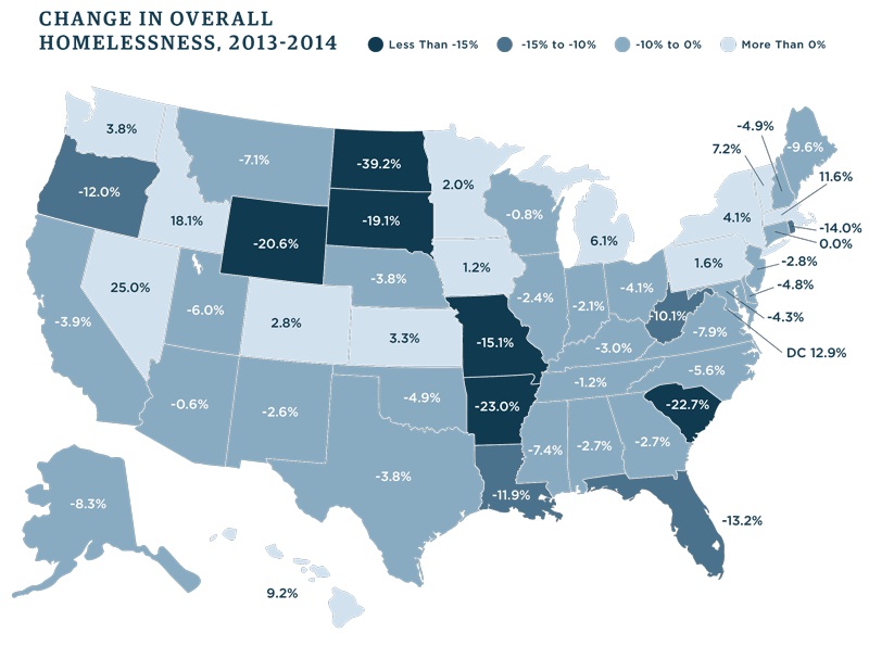 There is good news though: Every major subpopulation saw a decrease in homelessness from 2013 to 2014: unsheltered persons (10 percent), chronically homeless individuals (2.5 percent) and veterans (10.5 percent).