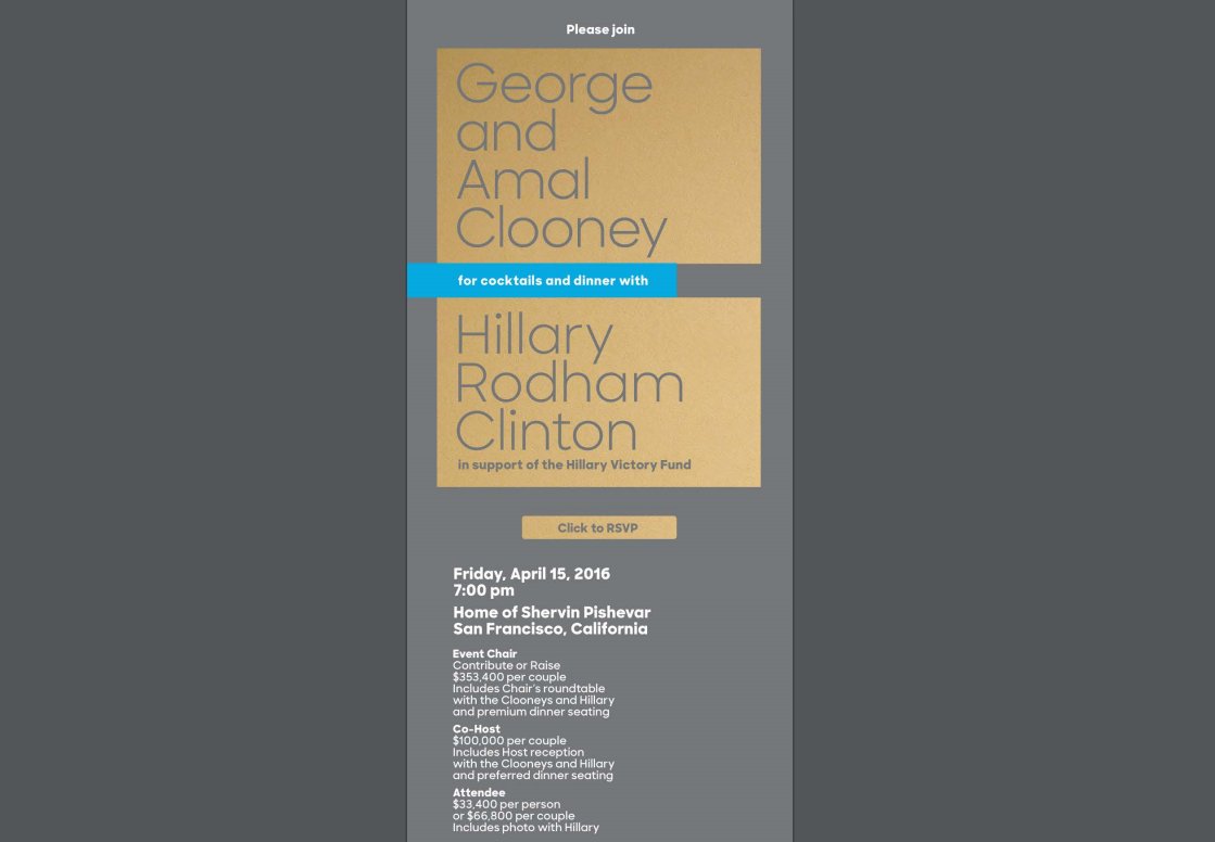Hillary Clinton asked supporters to pay $353,400 per couple to sit with her, George Clooney and his wife Amal at an exclusive fundraiser in San Francisco on April 15.