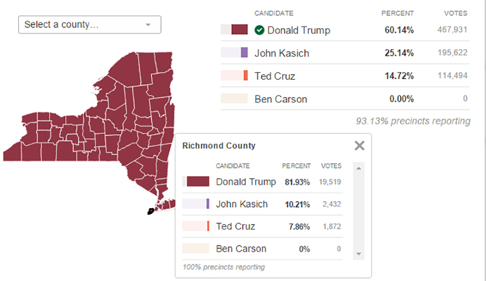 While Trump leads in most counties across the Empire State, he lost to Kasich in his home city, Manhattan, by less than 100 votes. Though Manhattan’s population of over 1.5 million dwarfs that of Staten Island (474,000), about the same number of Republican voted in both location on Tuesday.