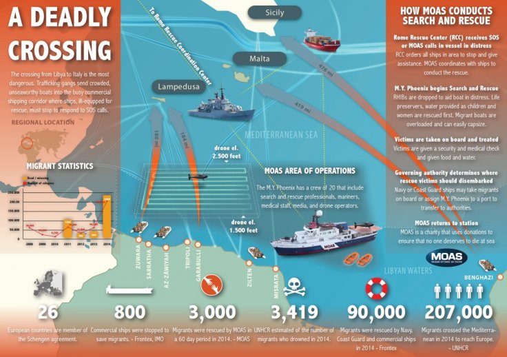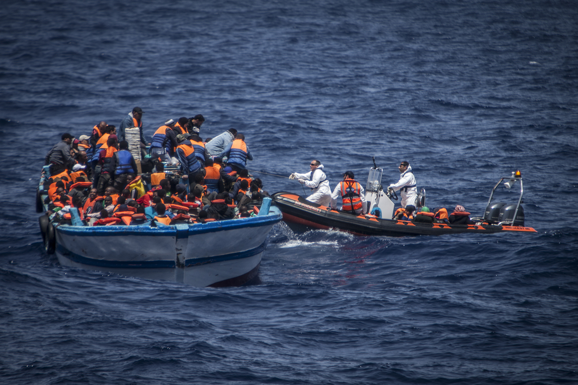 The Italian Navy deploys two frigates, two search and rescue vessels, and an amphibious assault carrier to help with rescue efforts. MOAS cooperates with the Italian rescue efforts. Both attempt to save any migrants they see.