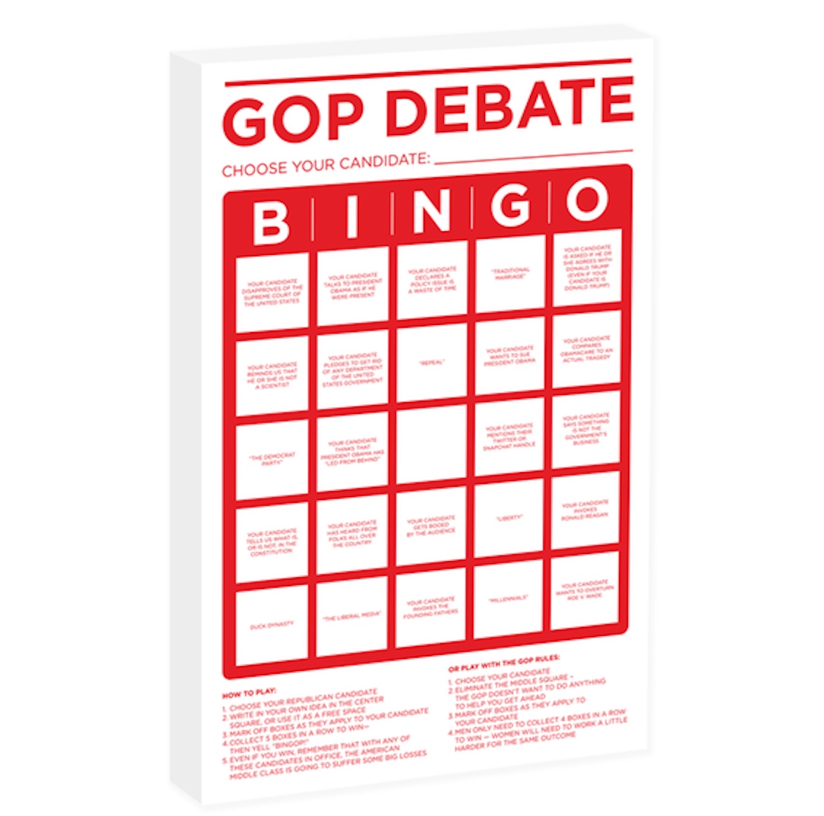 The stickers and cups say “I survived the 2016 GOP debates.” On the bingo cards are phrases or references that make fun of what Democrats imagine the Republican candidates might say in the first debate.