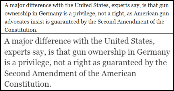 The Times’ article on German gun control has since been updated so that it now reads, “A major difference with the United States, experts say, is that gun ownership in Germany is a privilege, not a right as guaranteed by the Second Amendment of the American Constitution.”