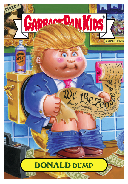 Trump, whose card is a recreation of a 2004 version of the billionaire businessman, is seen sitting on a gold toilet, unrolling a ream of toilet paper that looks a lot like the Constitution. His name on the card is “Donald Dump.”