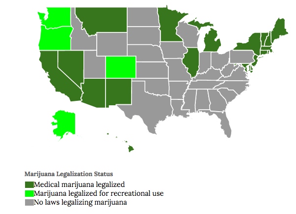 Both recreational and medical marijuana use is legal in Colorado, Washington, Alaska and Oregon. Ten states have both decriminalization laws and medical marijuana legalized, while nine have just legalized medical marijuana.