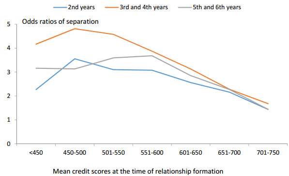 The study uses data on credit records of 12 million people over 15 years to examine relationship trends. The researchers found that people with higher credit are more likely to enter relationships and less likely to separate.