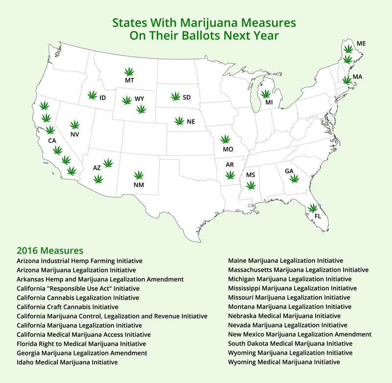 A total of 17 states will have marijuana measures on their ballots next year, almost triple the number in 2012, when there were pot questions on in just six states.