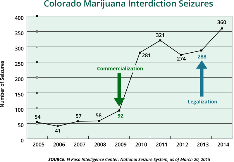 A preview of the Rocky Mountain program’s 2015 report regarding marijuana legalization’s impact on the state shows seizures of marijuana leaving the state rose 25 percent from 2013 to 2014, when retail stores opened for business. The number of interdiction seizures has risen 592 percent since Colorado’s commercialization of medical marijuana in 2009, according to the report.