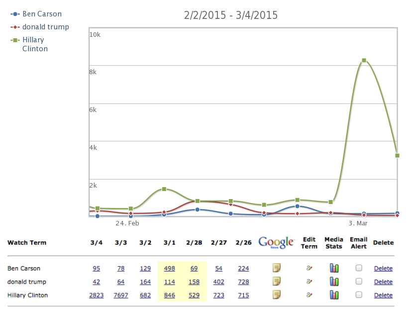 The real estate mogul enjoyed a burst of coverage last week following his claim that he’s the only candidate who can beat former Secretary of State Hillary Clinton in 2016, his speech at the annualConservative Political Action Conference in National Harbor, Md., and a statement to the Washington Examiner that he might abandon his catchphrase-generating NBC series “The Apprentice” in order to clear his path to the Oval Office.