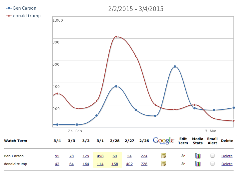 A Lexis search for “Ben Carson” shows newspapers, blogs, wire services and web publications ran 62 news articles all day Tuesday, most of those detailing the former neurosurgeon’s announcement. By comparison,the 2008 Presidential Medal of Freedom winnerhad already garnered 38 articles before Wednesday morning ended, the majority focused on his same-sex remarks.