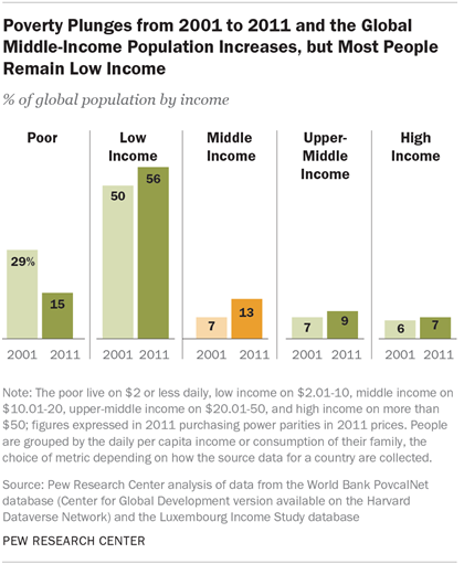 Poverty declined worldwide, but most of the world’s poor failed to make it into the middle class. More than half the world’s population (56 percent) remains “low income,” which in 2011 meant they were living on $2 to $10 a day. Those who live on $2 a day or less fell from 29 percent in 2001 to 15 percent in 2011. At the same time, the share of low income earners making between $2-10 per day increased from 50 percent of the world’s population to 56 percent.