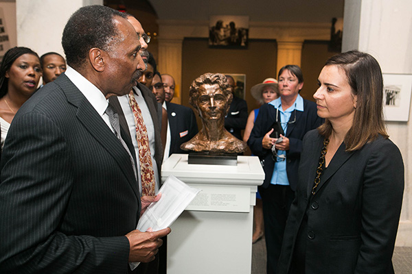 Senior fellow for the Family Research Council Bishop E.W. Jackson, stands in front of the bust of Planned Parenthood founder Margaret Sanger, with an in Washington, Thursday, August 27, 2015. (Graeme Jennings/Washington Examiner)