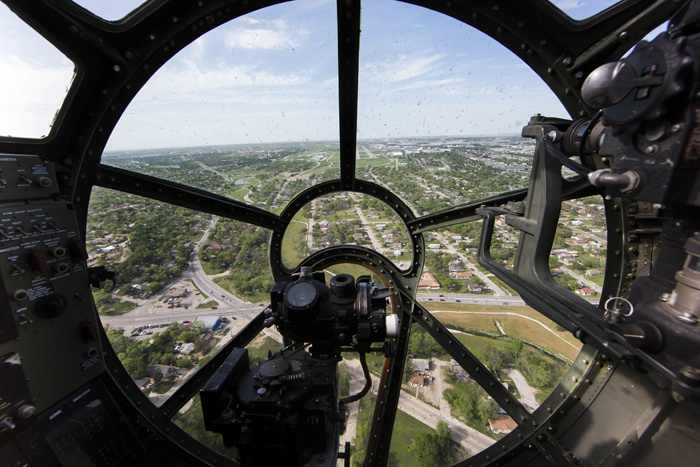 “I would hate to have to fly her in formation,” Benzing says about the U.S. Army Air Forces pilots and crews who did, flying 14 hours at a time in heavy clouds and terrible weather, required to hold tight diamond-shaped formations to defend against enemy fighters. Liberator pilots were often known by their swollen left-arm muscles, developed from hours of gripping the wheel left-handed.