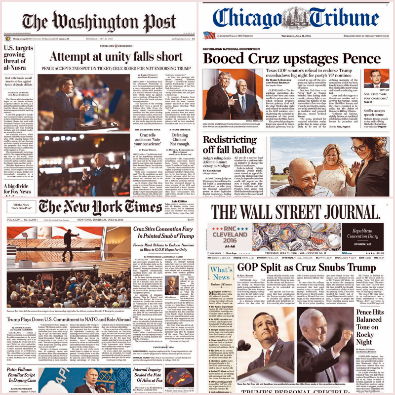 For print media, it was much of the same. The front pages of the most-circulated newspapers in the United States focused Thursday on Cruz’s non-endorsement, and Pence’s convention moment was included only as an afterthought or additional detail to the “snub” story.