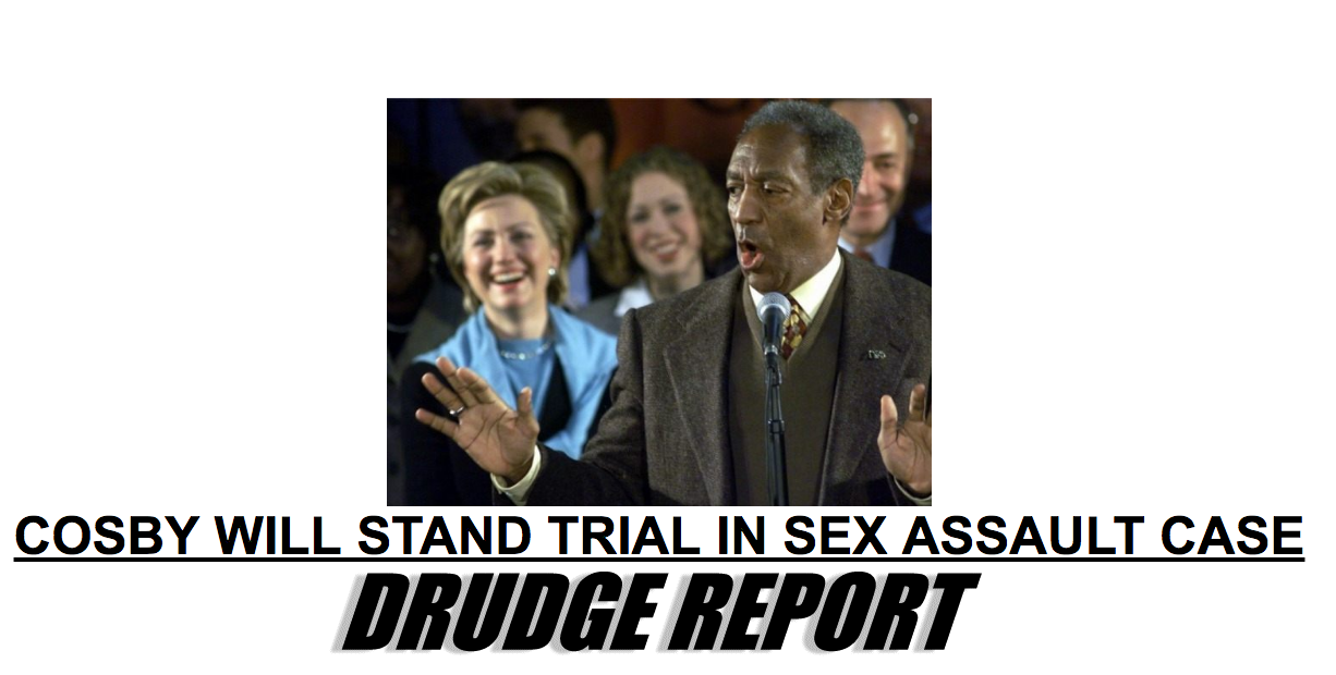 The Drudge Report responded Tuesday to news Bill Cosby will stand trial for sexual assault charges by tying the disgraced comedy legend to Democratic front-runner Hillary Clinton.