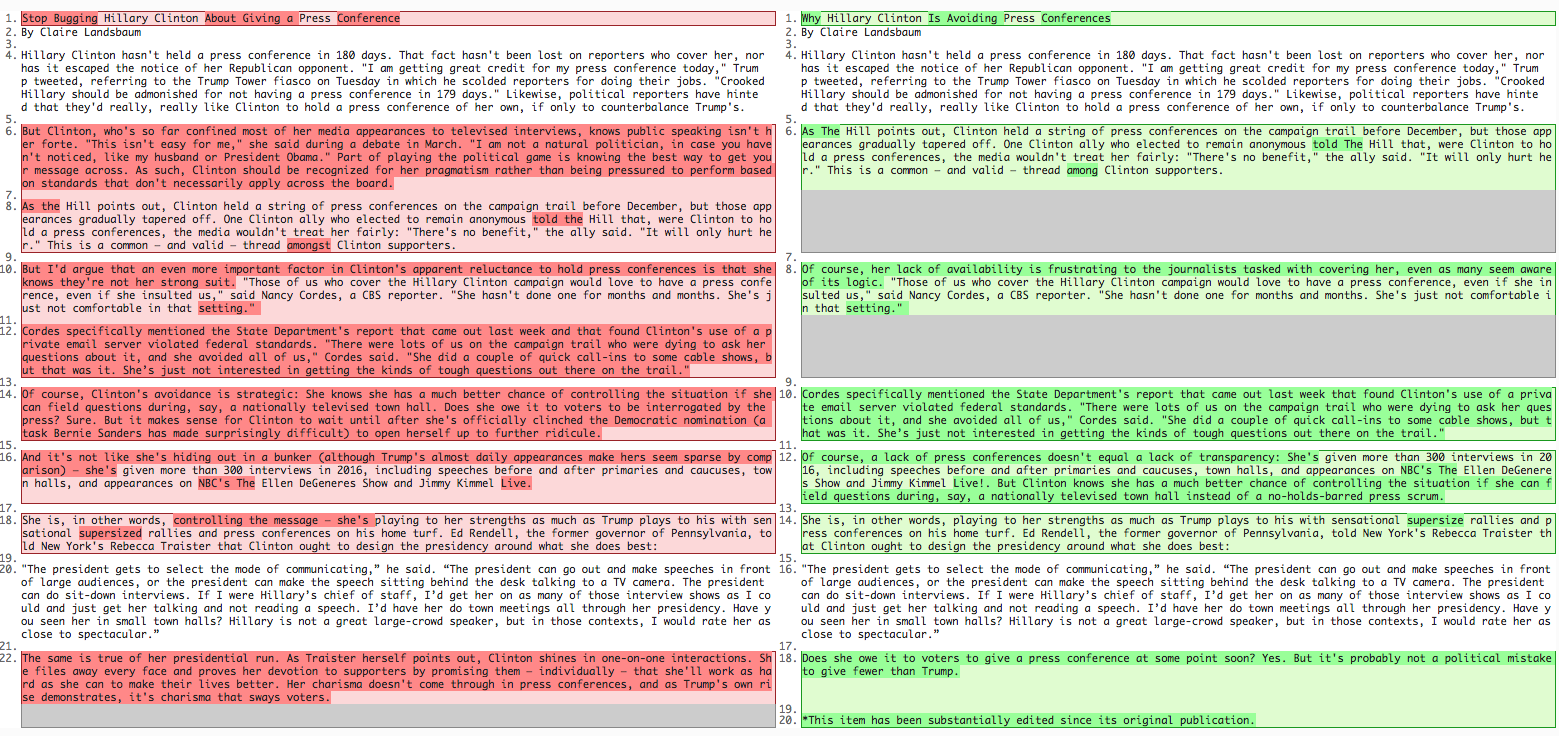 And then there are the passages that disappeared entirely, including a paragraph that once read, “And it’s not like she’s hiding out in a bunker (although Trump’s almost daily appearances make hers seem sparse by comparison) — she’s given more than 300 interviews in 2016, including speeches before and after primaries and caucuses, town halls and appearances on NBC’s ‘The Ellen DeGeneres Show’ and ‘Jimmy Kimmel Live.'”