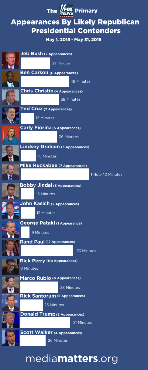 In May, Huckabee was the Republican candidate to appear most on Fox programming, according to a study by the liberal watchdog Media Matters. Huckabee made 7 appearances on the network, and was on for a total of 1 hour and 10 minutes.